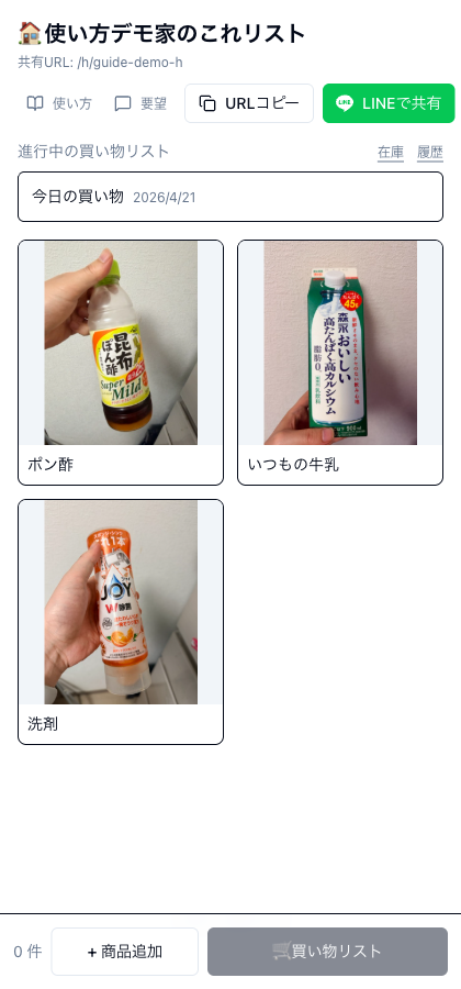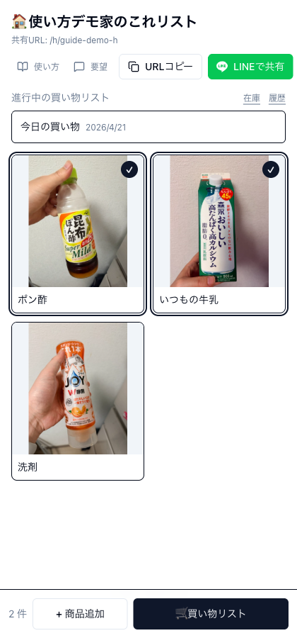 ヘッダーの「URLコピー」または「LINEで共有」で、買い物する家族にリンクを送ります。相手はアプリ登録不要。URL を開くだけでリストが見られます。