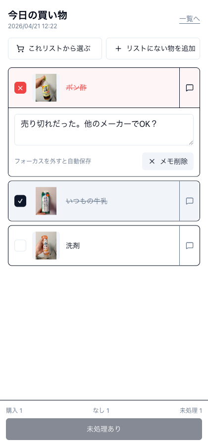 家族はリストを開いて、買った物をタップしていきます。タップごとに「未処理 → 購入済み → 買えなかった → 未処理」と状態がぐるぐる切替わります。メモ欄で「売り切れ、代わりでOK?」と相談も。