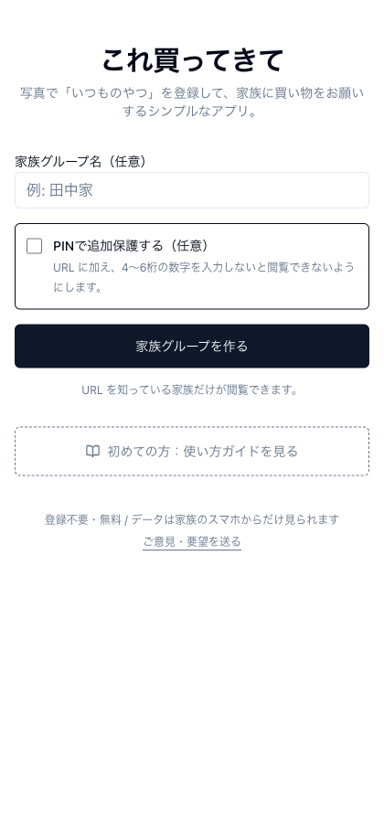 トップページで家族グループ名を決めて「家族グループを作る」をタップ。URL を知っている人だけが見られるようになります。PIN(4〜6桁)を設定すると追加で保護できます。