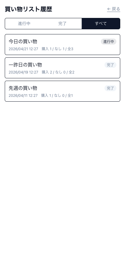 進行中・完了・すべて の 3 タブで買い物リストの履歴を一覧できます。「あの買い物どうなったっけ?」を後から確認したり、同じメンバーで定番化したリストを参考にしたり。